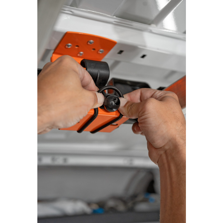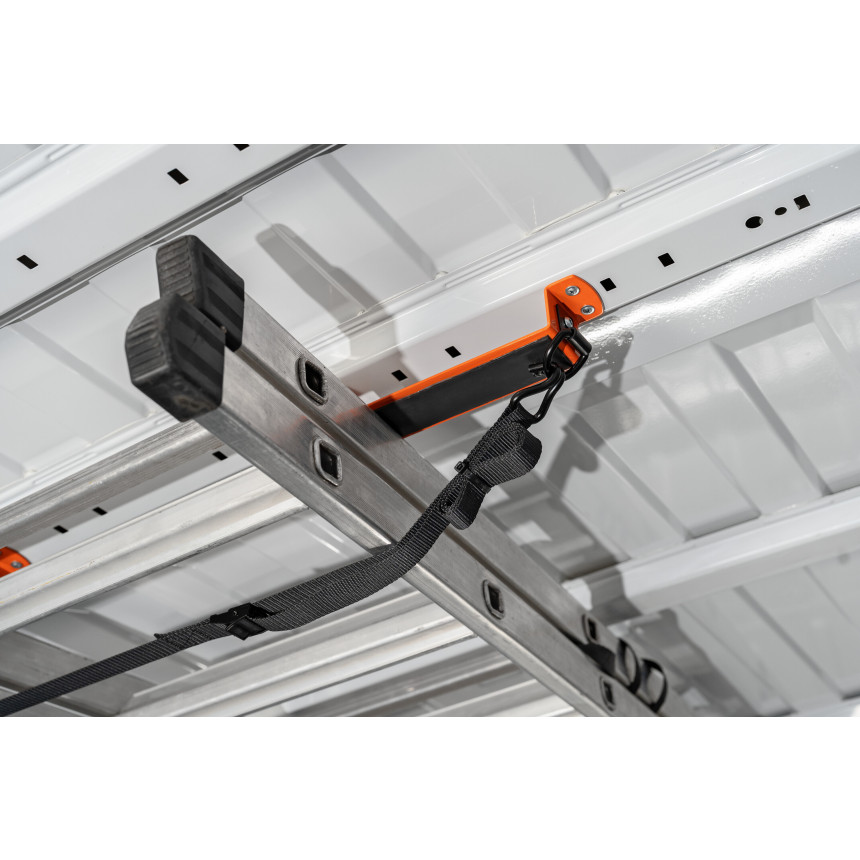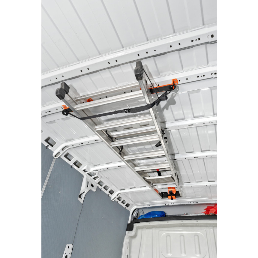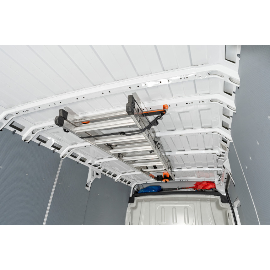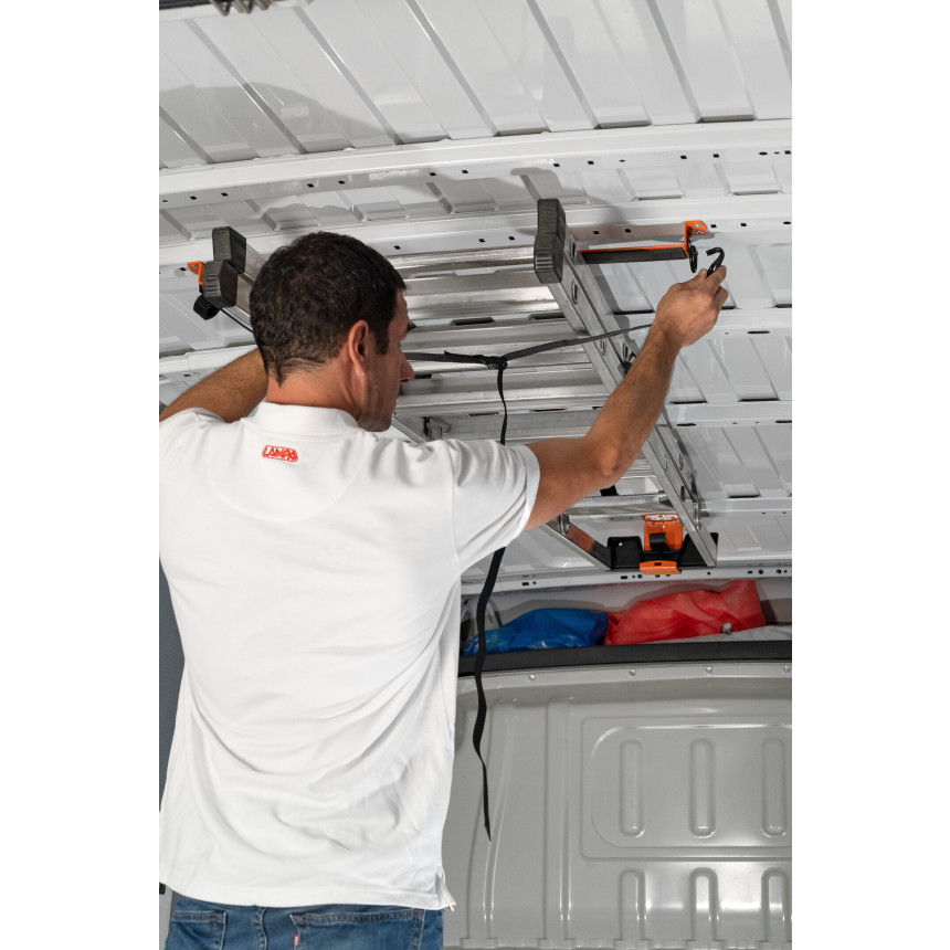Držalo za lestev je namenjeno profesionalnim uporabnikom, ki v svojem dostavnem vozilu ali servisnem kombiju želijo učinkovito pospraviti lestev v notranjo organizacijo tovornega prostora. Namesto da lestev obračate in pritrjujete na streho vozila (kar pomeni višje nalaganje, tveganje za poškodbe, dodatno porabo goriva ter manj prostega strešnega prostora), omogoča ta sistem varno montažo znotraj vozila – pod strop ali ob stran stene – ter s tem maksimalno izkoristi notranjo prostornino.